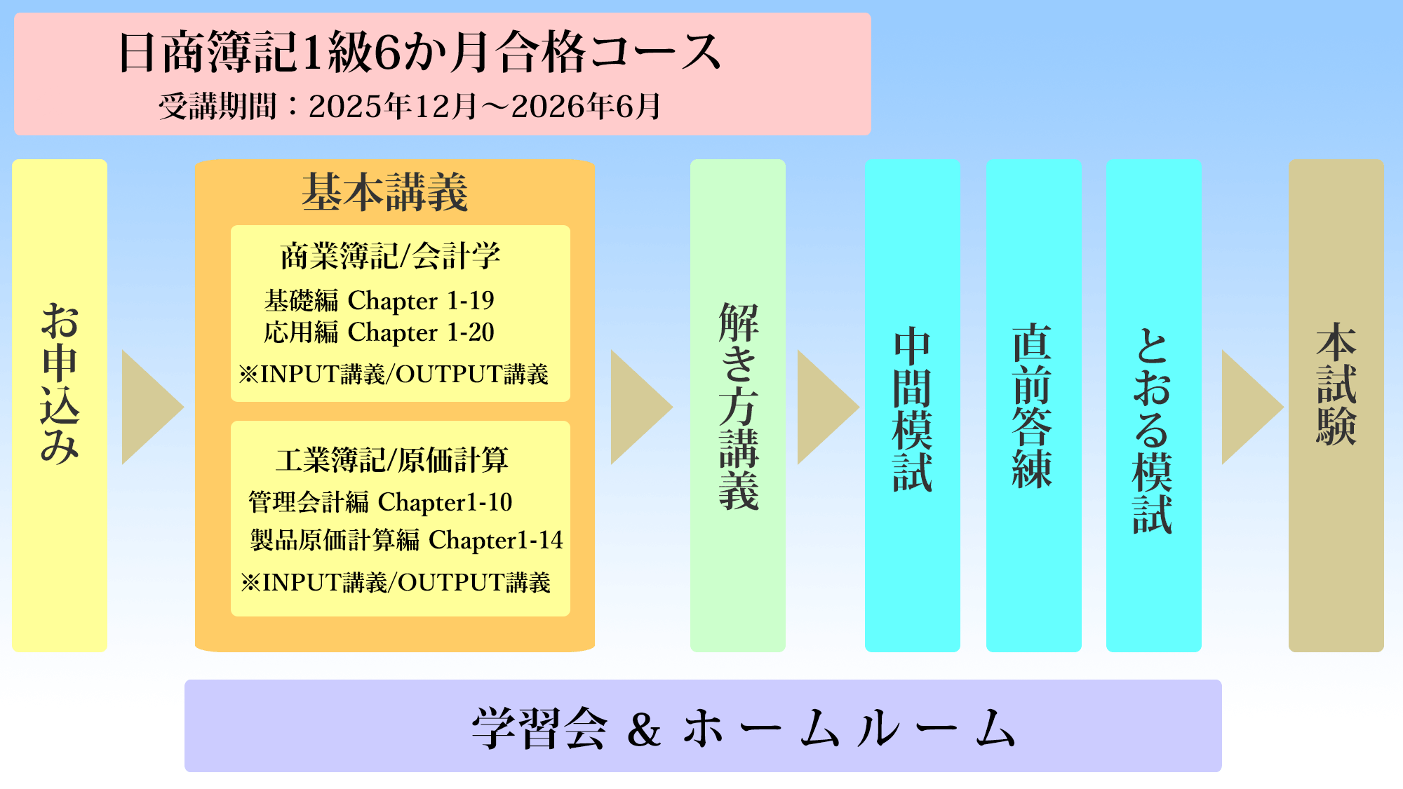 日商簿記1級の内容を約半年(6か月)で基礎から試験対策まで一環して学習するコースです。