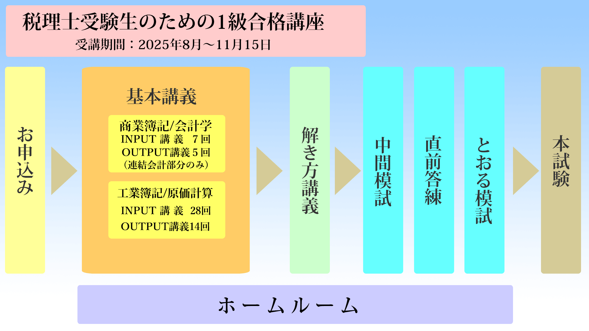 | 基本講義学習後、本試験と同レベルの問題演習対策で本試験対策を行います。 |